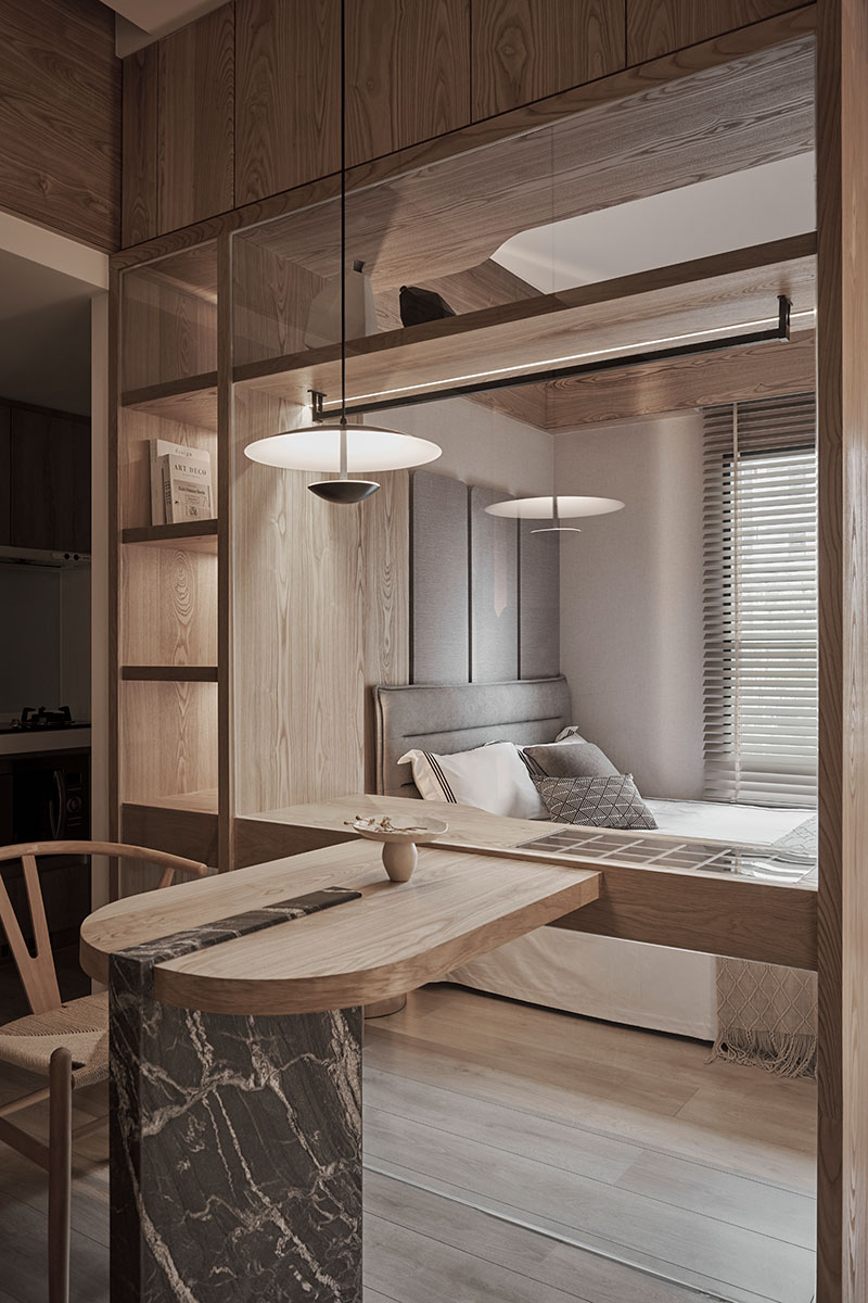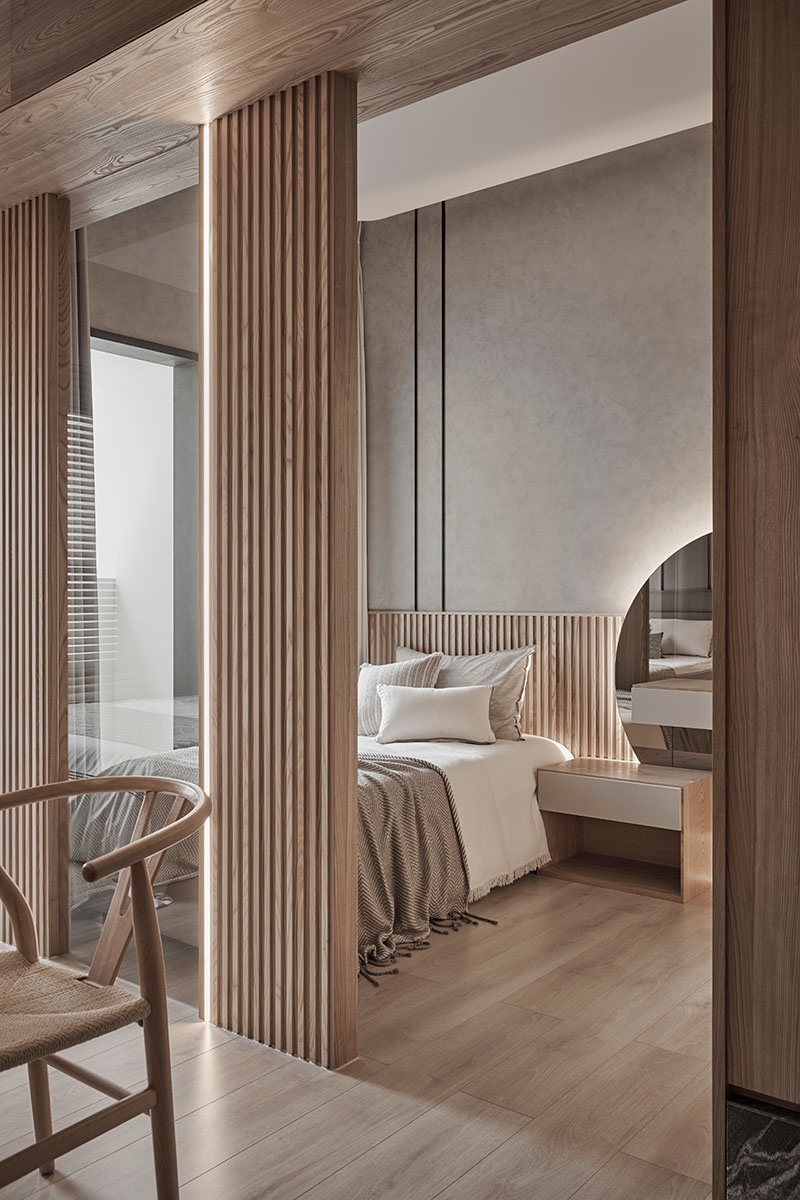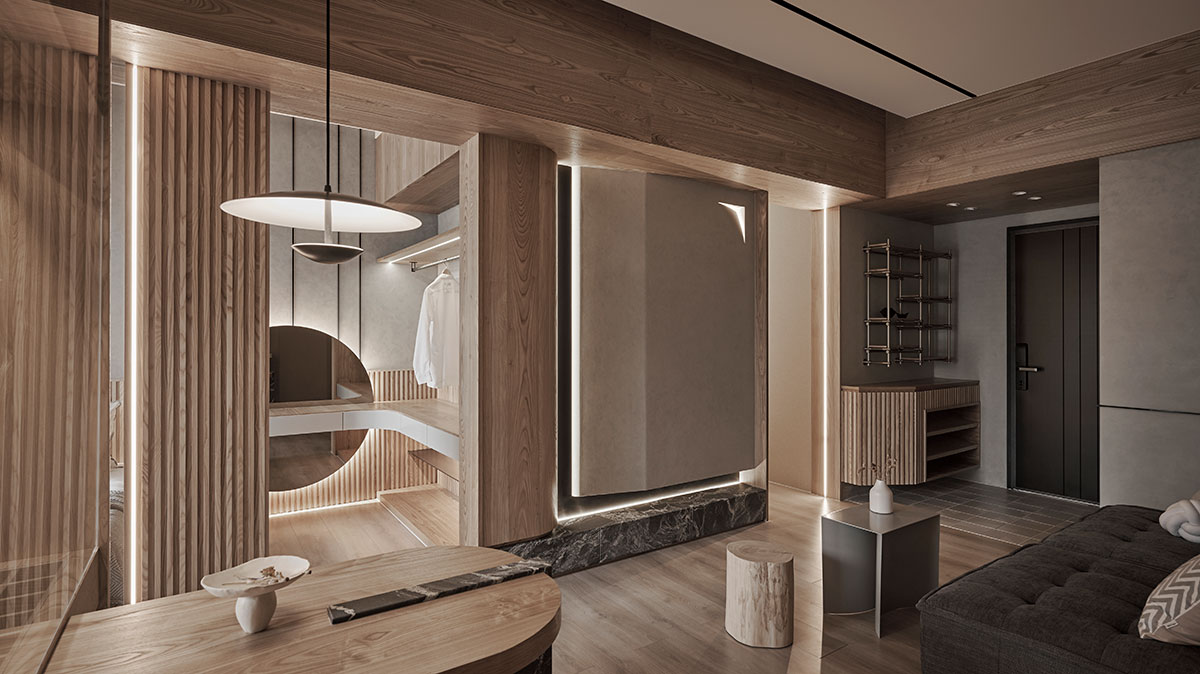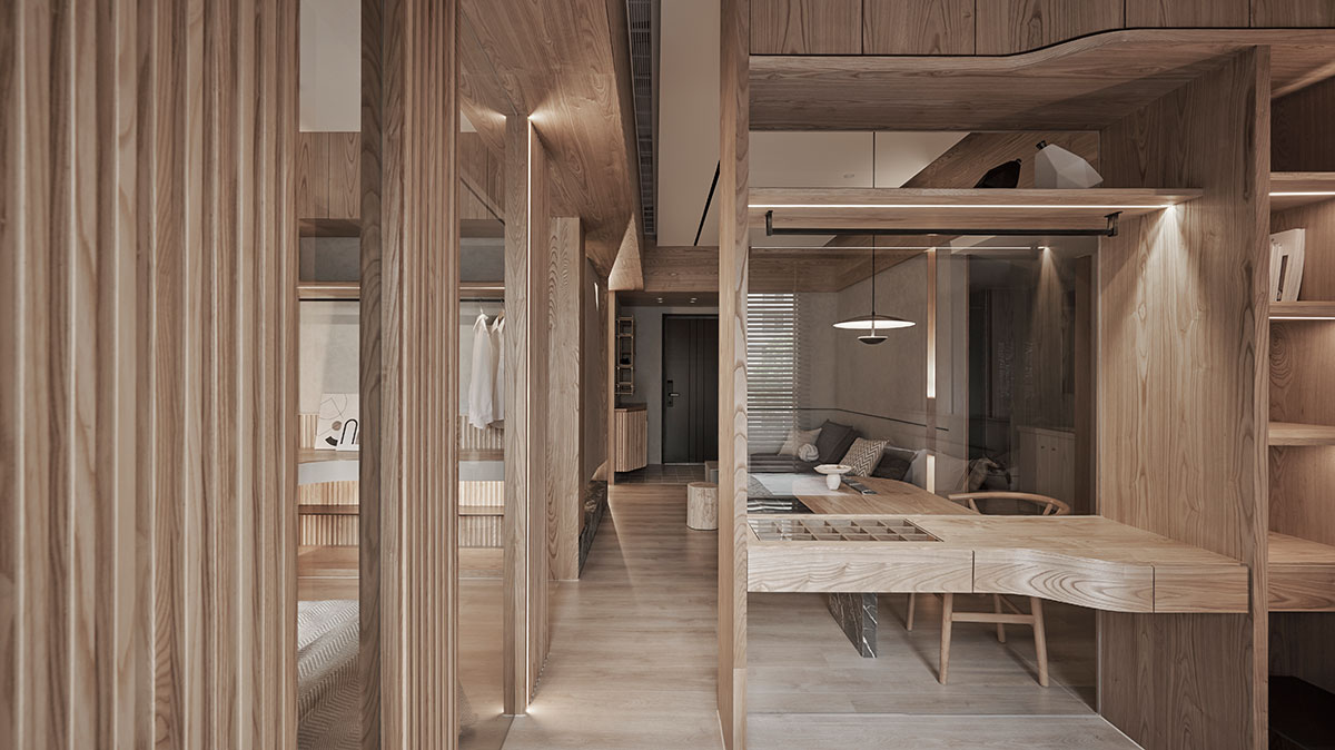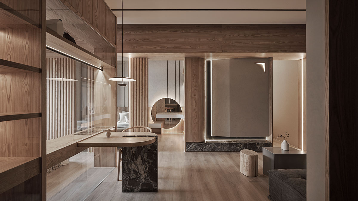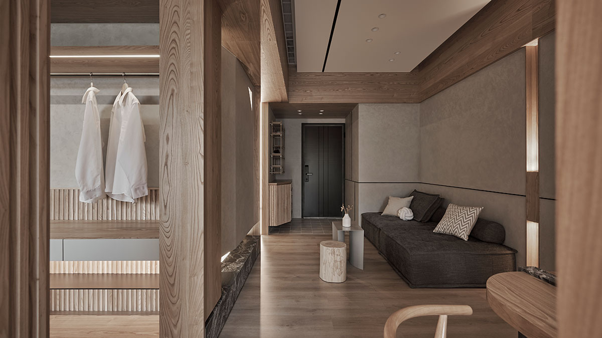推開大門,溫潤的木質調相偕沉穩石材、清水模塗料,於空間層層鋪就開闊無礙的日光大道,令人一眼賞盡滿室靜雅的侘寂光景,流轉其中的線型光源及金屬飾條,低訴著現代設計語彙,替靜謐的質感場域,增添一抹內斂的時尚新潮。