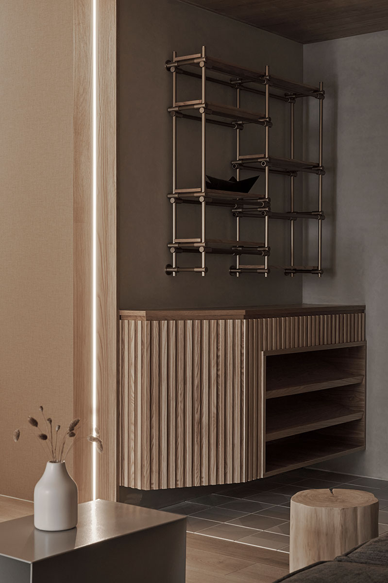 Open the door, the sunbeam avenue welcomes the guest with the gentle wood arrangement and fair-faced concrete features, then eye the art of imperfection. Strip light and hardware embellishment word the modern fashion also enhance an understated vogue for this residence.