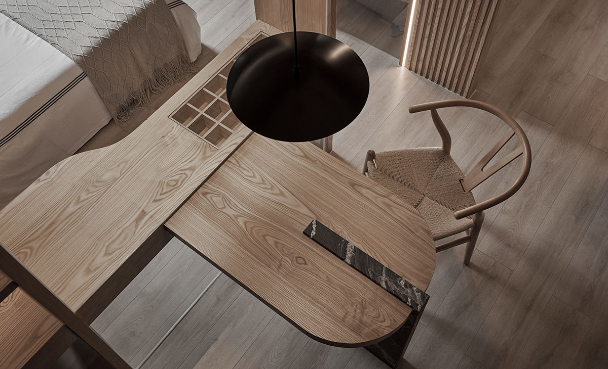 思及樣品屋的展示功能,我們除卻門片,並以清透玻璃取代大量隔間牆,達成放大場域空間的效果,同時選用可重複利用的天然建材,搭組成歷久彌新的經典風格,不僅予以賞屋者對未來生活的願想,更展現對環境的關懷之情。
