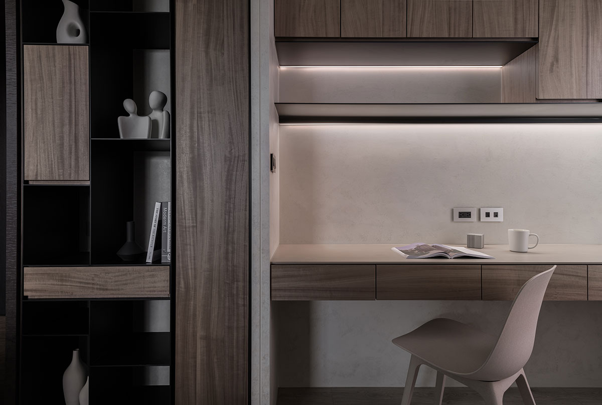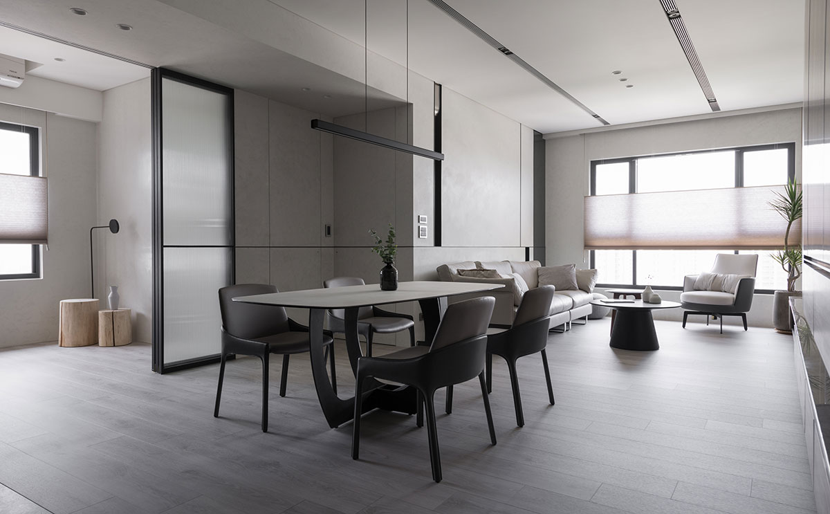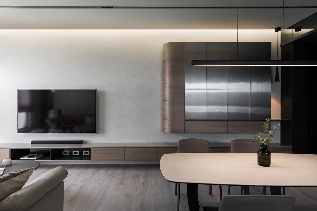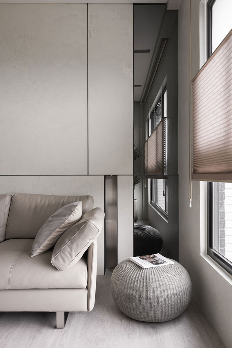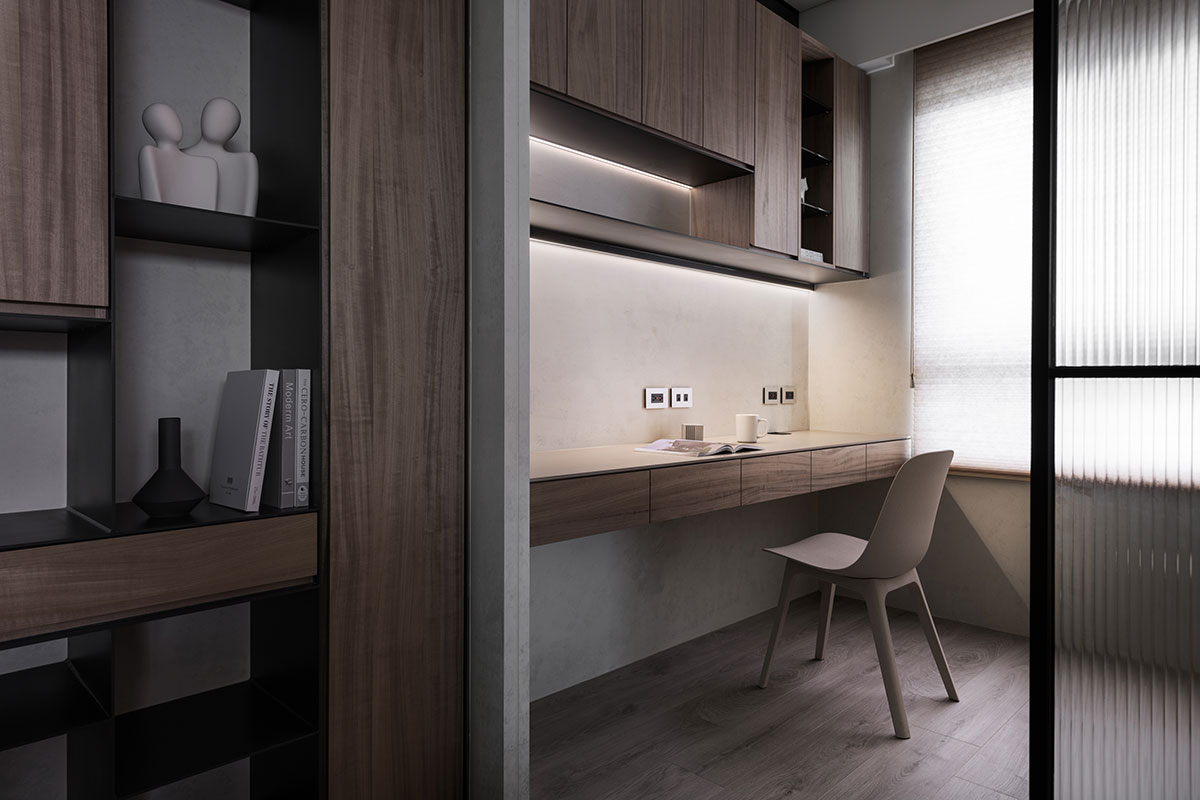 The property owner works in the design field and most often deals with the high color saturation schemes; however, we adopt the low Chroma theme to inspire the proprietor's imagination of colors. To coincide the demands, demolished the original partition wall of the second bedroom, and transformed into a semi-open working area, hence, brings about the complex pattern of studio and dwelling. Moreover, make use of hidden doors to conceal the private areas and the bathroom. Ingeniously, take the advantages of the construction materials to extend the spatial layout, so that creates an up-to-date humanistic domain of captivating features.