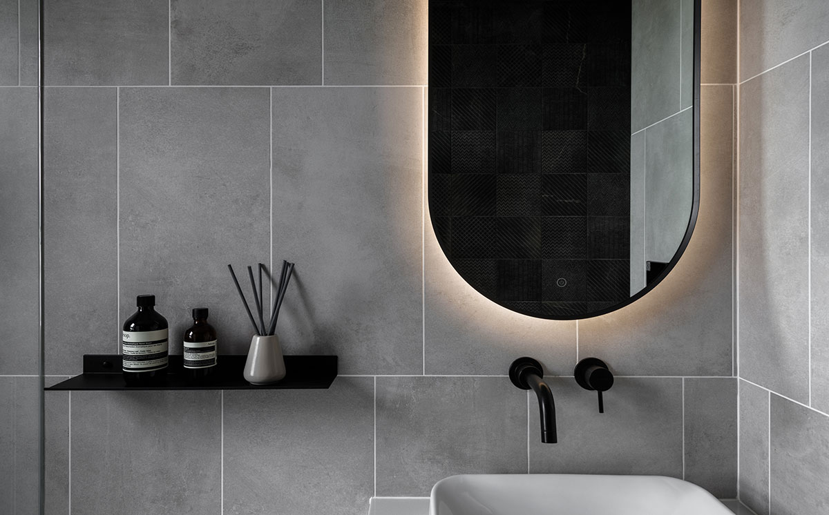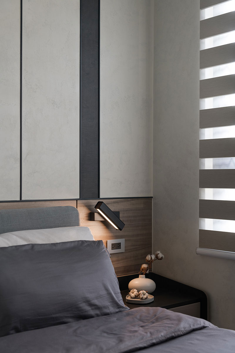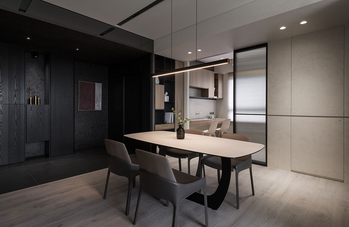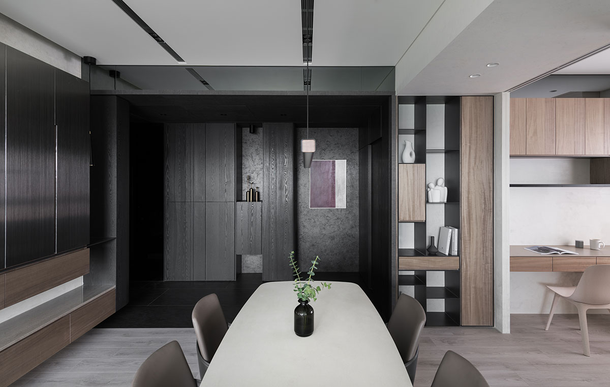 業主身處頻繁接觸高彩度色彩的設計行業,響應其需求,在配色上選用低彩度的方式呈現,使其身在其中,能擁有對顏色更豐富的想像;在此之上,結合工作室及住家氛圍,拆除原有的次臥室隔間牆,將之改造為半開放式工作區,並利用暗門形式,隱藏私領域與衛浴空間,搭配建材使用,延伸空間視感,創造兼具層次感與錯視趣味的現代人文場域。